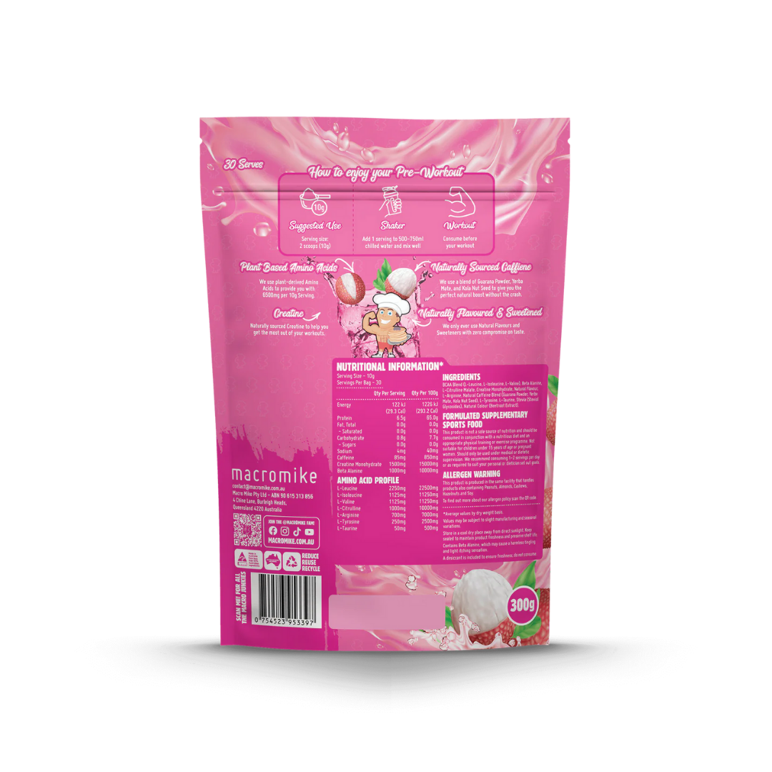 What it does: Pre Workout – Lychee by Macro Mike is formulated to support training output, performance and post-session recovery. It fits seamlessly within a high-performance, health-first supplement routine.